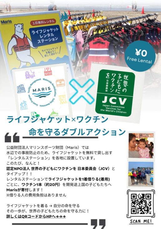 全国のライフジャケットレンタルステーションで皆さまが借りた1着につき事務局が20円の寄付を行い、開発途上国へワクチン寄付にJCVが活用します💉🌏