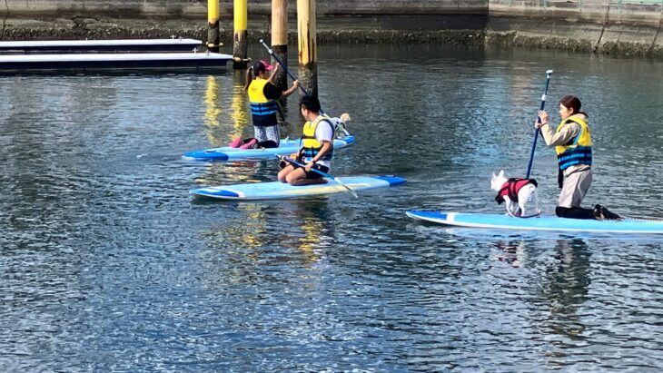 その後、水上でワンちゃんと飼い主さんが一緒にSUPに乗り、インストラクター指導の元、基本動作の確認を行いました。