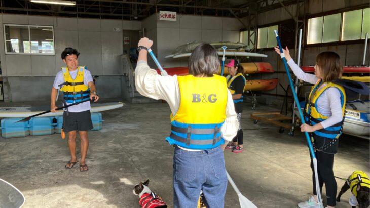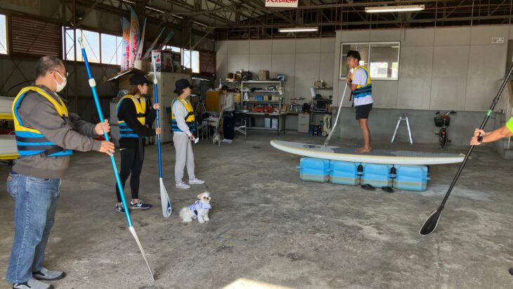 SUPを初めて体験する方もいたので、始めは陸上でパドルの使い方やボードへの乗り方やワンちゃんが乗る場所など基本的な講習を行いました。